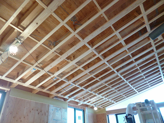 2階の子世帯では傾斜天井(ロシアンバーチ合板張り)の下地が組まれました。天井下地(野縁)は「いーにっさん」と言われる約30×40mmの木材を使って、40の面を下に向けてを組みますが、ロシアンバーチ合板の継ぎ目がくる位置には、幅広のものが使われています。