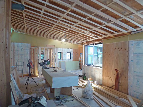 親世帯のスペースと二世帯共用の水廻りがある1階では、天井下地が組まれたあと、押入れや枠廻りなどの造作中。