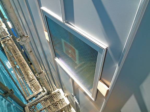 ガラスと一体となった住宅用サッシと違って、ビル用サッシの場合はサッシ枠を先につけて、ガラスは後から入れます。