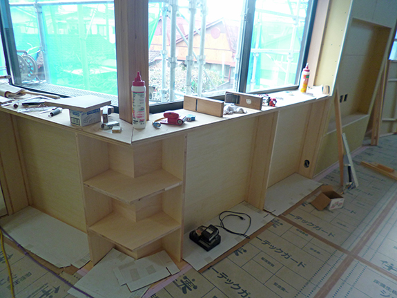 窓辺の本棚も施工中です。コーナー部分は固定棚ですが、その他は棚は間隔を好きな位置に調整できる可動棚になったシナ合板の本棚です。本棚上部の板は、窓の下端と揃えてスッキリ納めます。