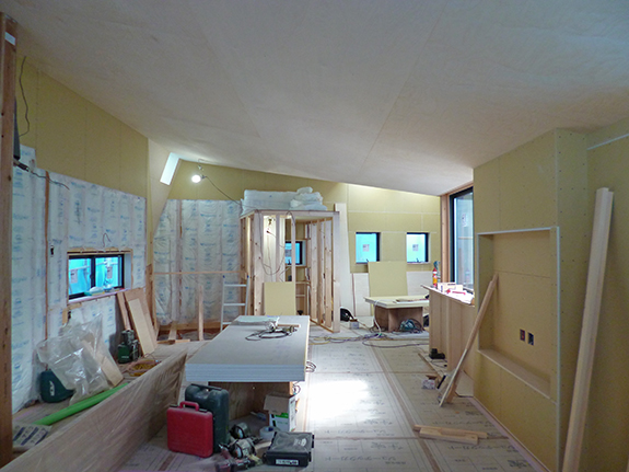 『ミカンの木の育つ二世帯住宅』(木造2階建・在来工法)の現場では、木製階段や本棚の工事がはじまりました。