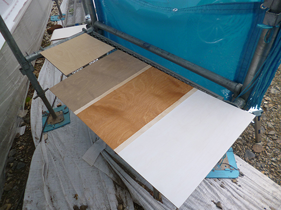 ロシアンバーチの天井材の塗装を確認。外部の軒天井もあるので、塗装サンプルに水を垂らして、実際の防水性を確認しました。