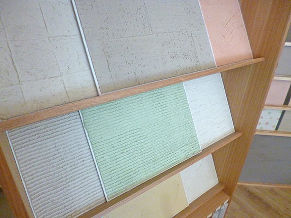ショールームでは壁や天井にシリカライム(天然水硬性石灰+音羽晶石+天然由来の顔料)が実際に塗られており、色合いやテクスチャー、仕上パターンなどを見ることができます。
