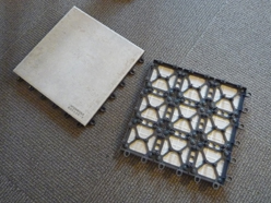 プラスチックの凸起でタイル同士が結ばれ、その下を水が流れる機構で、屋上テラスの床に使う予定です。
