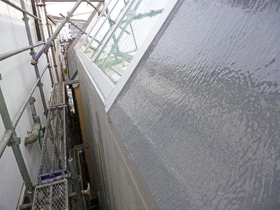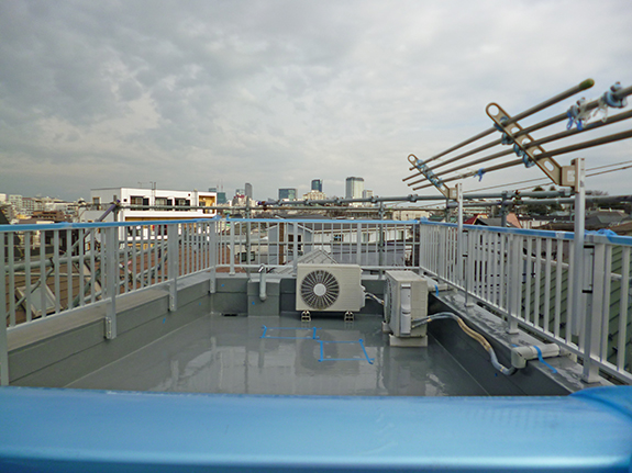 屋上防水は元はアスファルト防水の上に押えコンクリートでしたが、今回はその押えコンクリートの上にウレタン防水を塗り、パラペットと言われるコンクリート立上がり部分にもウレタン防水を施しました。