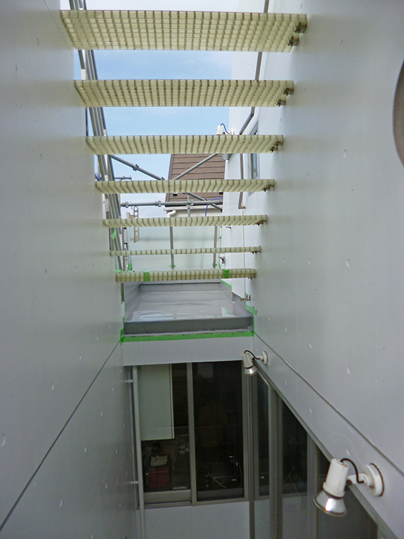 室内に光を呼び込むテラスの外壁は、高圧洗浄の上、元のように白く塗装。