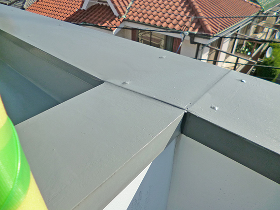 金属笠木の継ぎ目やビス穴部分からの水の侵入を防ぐ目的で、屋上の金属笠木部分にもウレタン防水を塗りました。