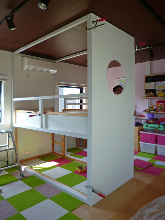 IKEA・イケアのリバーシブルベット(KURA・キューラ)の周りに、フレームとパネルを造作し、オープンに使われていたチャイルドスペースを2つのスペースに分けました。