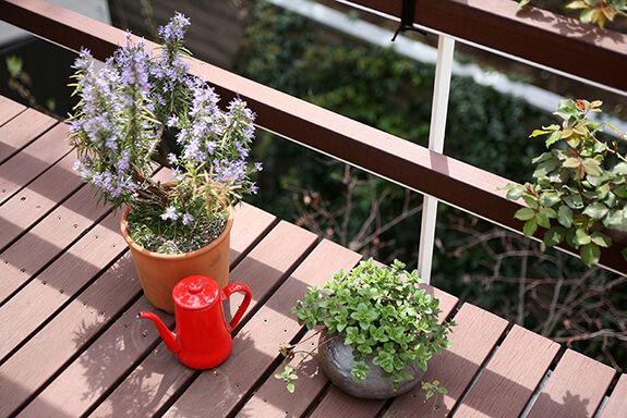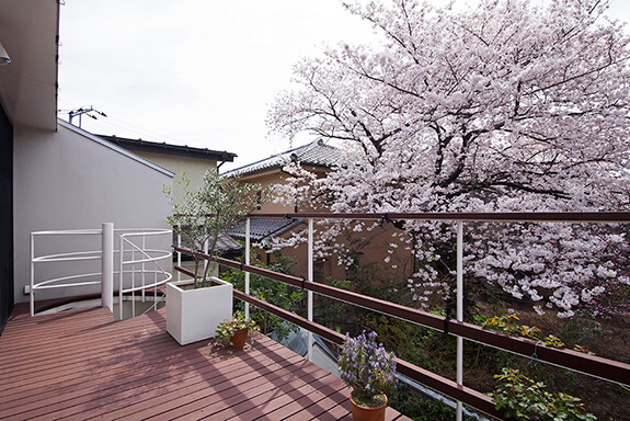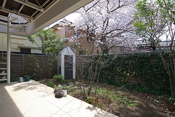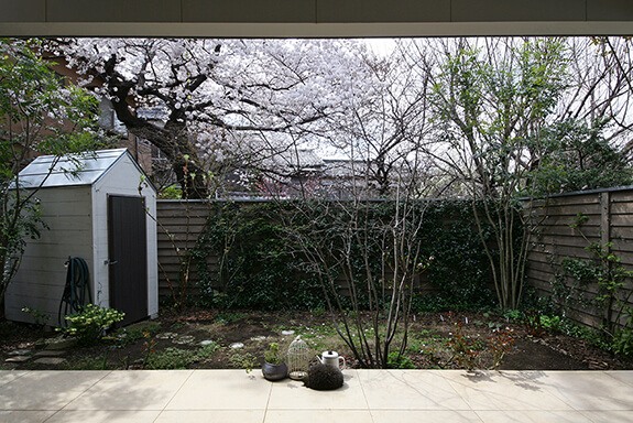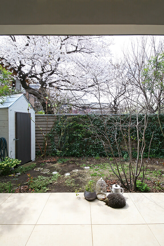 アトリエの前にはフランス田舎風の庭があります。板塀の向こうにも隣地の緑が広がっていて、桜はちょうど満開を迎えています。