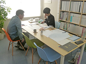 今日は、下足入れやキッチン収納、テレビカウンター、クローゼットなど、1/20のスケールの家具図をお見せしながら打合わせしました。収納方法や使い勝手のほか材料や仕上げ方についてもご説明し、仕上げの色の好みもお聞きしました。