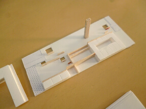 図面だけではで分かりにくい、キャットステップやキャットウォークを造りつけるLDKの壁面は、当初案との違いがわかるように模型もお見せしました。