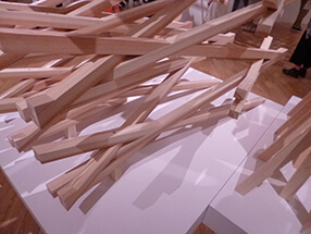「くまのもの 隈研吾とささやく物質、かたる物質」展はタイトルが示すように、よくある建築家の作品展とはちがって、隈研吾&隈研吾建築都市設計事務所が材料・マテリアルを武器として建築の世界に新たな可能性を見出し、切り開いてきた軌跡を分類・整理して展示してあります。