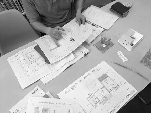 構造は今まで何回もやり取りをしてきているので、耐力壁や柱の位置、梁の大きさ、などはほぼ決まっています。今回は基本設計から変わってきた点について打合せし、実施設計を進める上で必要となるより細かな点について確認していきました。