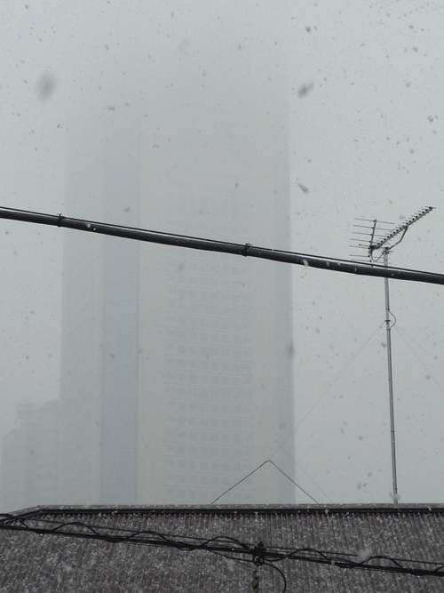遠くに霞んで見えるのがオペラシティ。夕方には手前の屋根に雪が2cmぐらい積もりました。