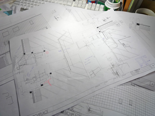 今までは「内部の秩序(間仕切り壁や家具の位置など)」だけで決めていた窓を、「外部の秩序(タイル貼の目地)」とも合わせなければならなくなり、「内部」を優先すれば「外部」がおかしくなり、「外部」を優先すれば「内部」がすっきりせずという感じです。事務所内で意見を戦わせ、生みの苦しみ(楽しみ?)を感じつつ、「両方の秩序」を満足させる新たな窓の位置を探っていきました。