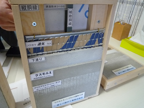 設計事務所アーキプレイスで設計中の二世帯住宅、『みんな集まる家』の外壁は左官で仕上げます。左官壁の仕上げでは、その下地がクラックを防止するポイントとなるので、新しい左官壁下地の工法開発しているメーカー・富士川建材工業(株)の方に来てもらい確認しました。