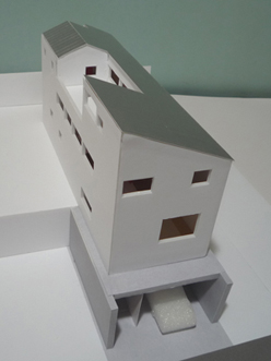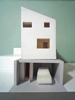 敷地は間口5.4m、奥行き18mの東西に細長く、道路面から2.5m上がったところが設計地盤面。南北と西の三方を建物に囲まれた、条件の厳しい土地です。