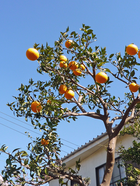 冬の晴れ渡った空には、オレンジや黄色の実が映え、