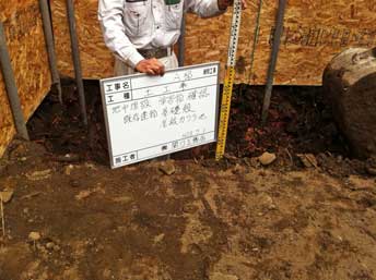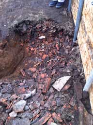 地面を90センチぐらい掘った、さらにその下に60センチぐらいの瓦の層が。工事会社の人の話では、焼け野原になった戦争前後に埋められたものではないかとのこと。