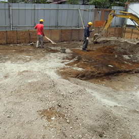 その部分の処置を構造設計者を交えて検討し、先日、セメント系固化材と現場の土を混ぜて浅層改良(表層改良)を行ないました。