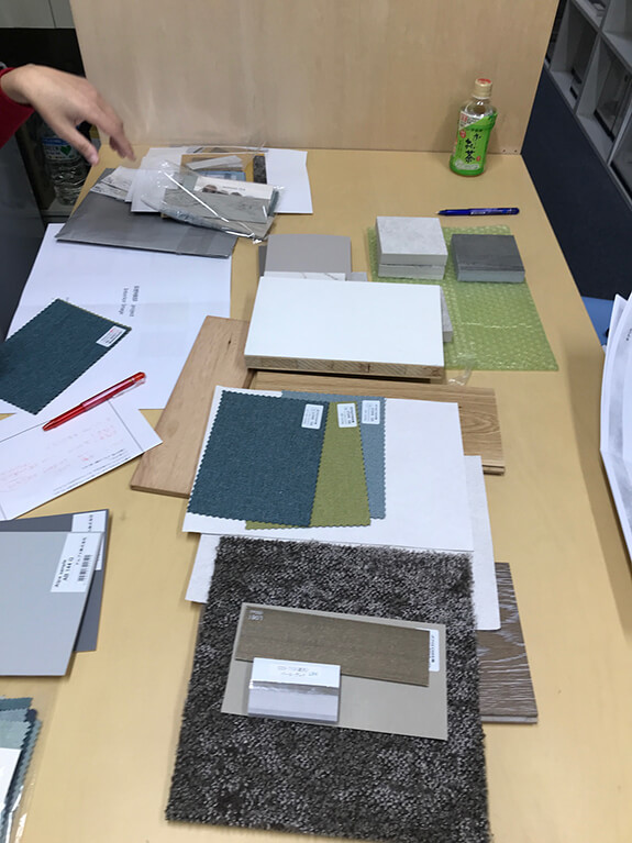 インテリアの総まとめで、内装の主要な仕上げ材からウインドウトリートメントまで現物のサンプルを並べ確認していきました。