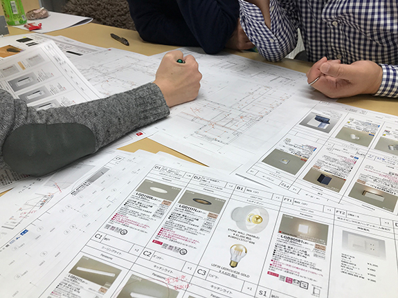 先週に続き、『都会のオアシス中庭のある家』(在来工法木造2階建)の設備をより詳しく、主に電気設備のお打ち合わせです。