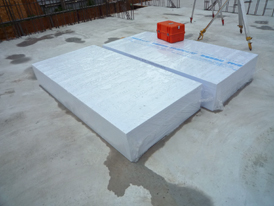 現場には、RC基礎外周の地中部分の断熱に使う、ポリスチレンフォームの防蟻断熱材も搬入されています。