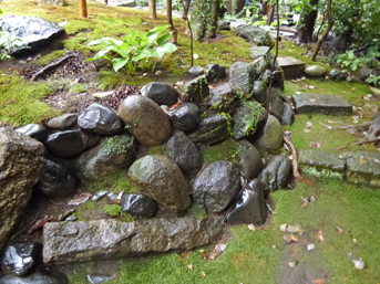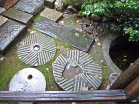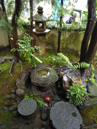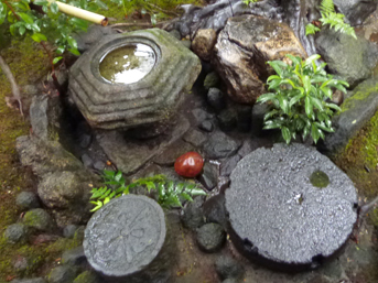 蹲踞(つくばい)。手水鉢、役石、植栽、灯籠がなんとも言ない空間を生み出しています。中央の茶色の石(?)は何だったかよく見なかったのが残念・・・