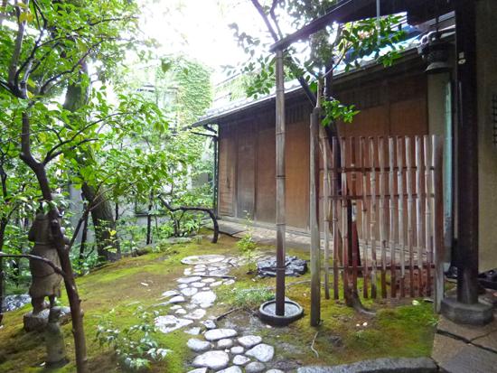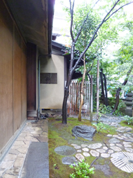 玄関へのアプローチ。アプローチの左が応接室側の庭。右には茶室側の庭がある。