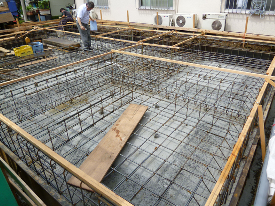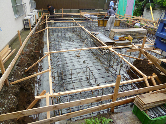 雨で少し工事が遅れたため、鉄筋工事と型枠工事が急ピッチで進んで