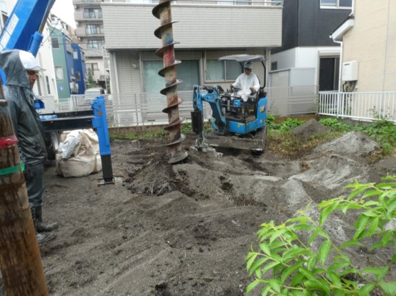 地盤改良はプレコンサンドパイル工法で、リサイクル砂+セメント系固化剤を地面に圧入して、表層を柱状改良(今回は2m程度)する、排土の出ない工法です。(7/1/2024)