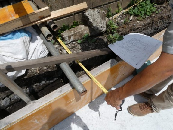 根伐り工事の後、砕石工事が敷かれて捨てコンクリートが打たれ、地墨の確認に行きました。(8/2/2024)