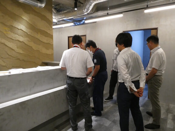 C工事の現場監督さん主導のもと、B工事業者さん、ビルのテナントの貸主側の方に来てもらい、施主検査を行います。B工事の設備業者の方(空調、換気、防災)には簡単な取説もしてもらいました。(8/1/2024)