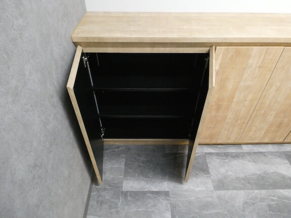 エステ部分の収納家具は木目調で、カウンターは傷の付きにくいメラミン化粧合板、扉はポリ合板です。