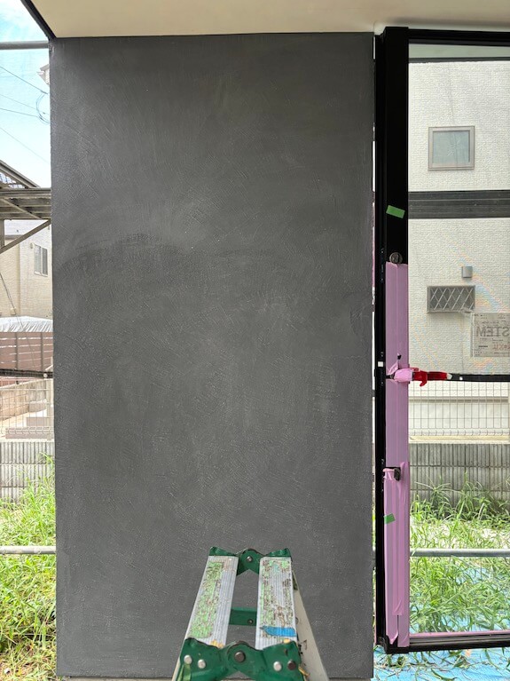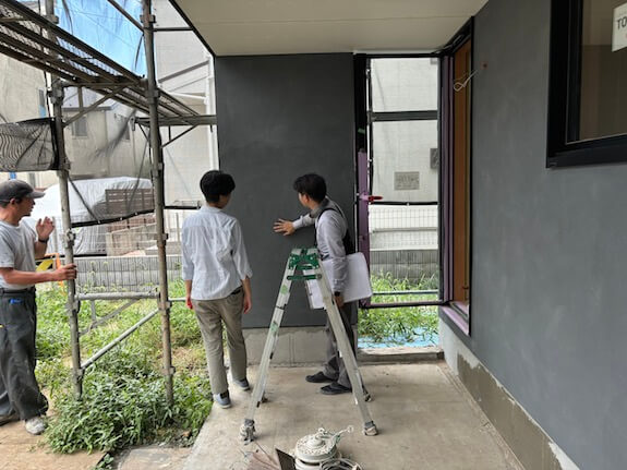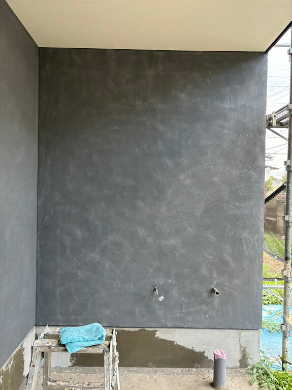 『クランクした敷地を活かした家』(東京都東久留米市)では、左官の仕上げ(ジョリパットインフィニティ サンディング)サンディングの施工方法を決定するため、左官屋さんに現場の壁に3パターン作ってもらいました。(8/24)