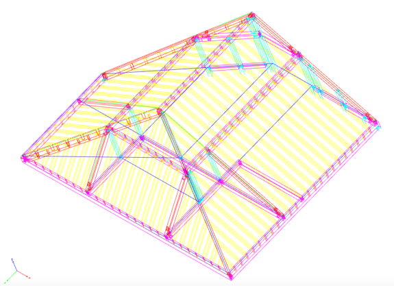 上の3枚の画像は、垂木や隅登り梁の実際の加工寸法を出す元になる、小屋組の3Dデータです。