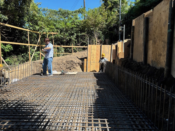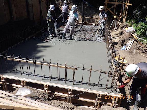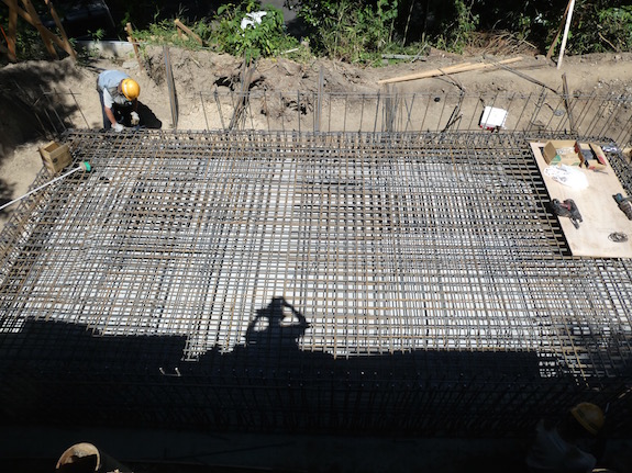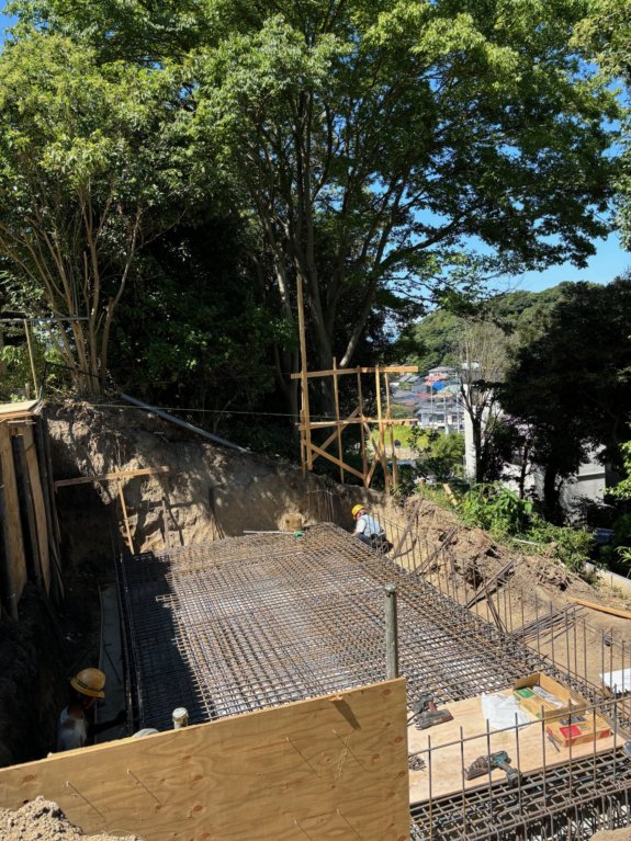 『遠くの海を望む家』(地下RC1階+地上木造3階建)の地下基礎耐圧版の配筋検査に、構造設計の中村さん(中村哲建築設計事務所)と行きました。(9/13/2024)