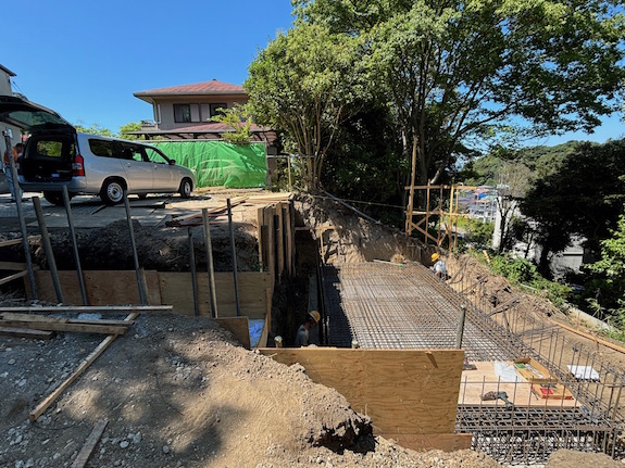 敷地は傾斜地で、左の車が停まっているところが1階レベル。右側の鉄筋が組まれているところが地階レベルで、土地の傾斜に合わせているので、地階レベルでも地上と同じように窓や入り口を設けることができ、土工事量を抑えることで、工事費を節約できる断面形状の計画になっています。
