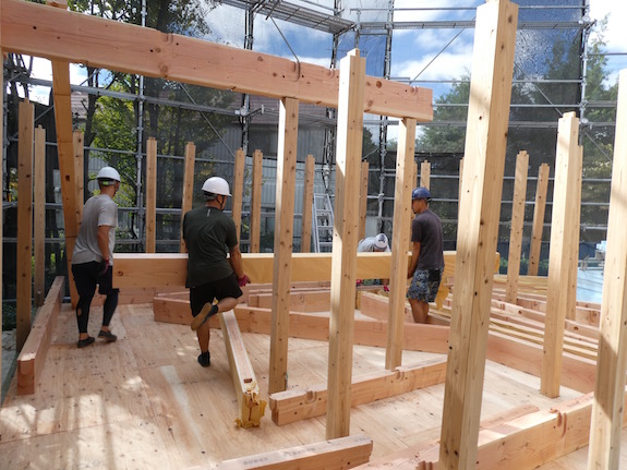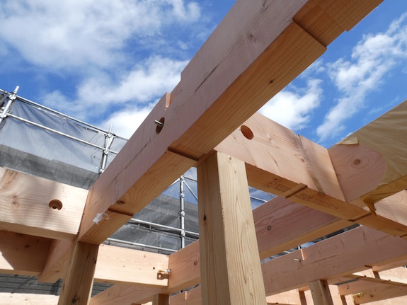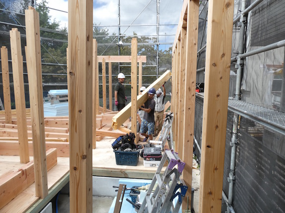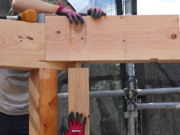 所定の位置への梁の取り付けも人力ですが、大きな梁は監督さんや大工さんも協力して行なわれました。