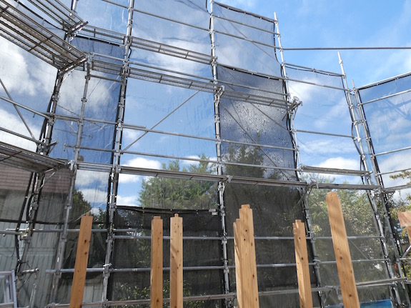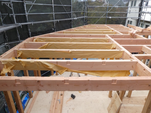 2階は屋根の形が室内に現れた天井の高い空間になるため、1階から2階への通し柱は設けておらず、2階の床合板を仮留めした後、2階と小屋の建て方までに雨に濡れないように、ブルーシートでぐるりと覆います。