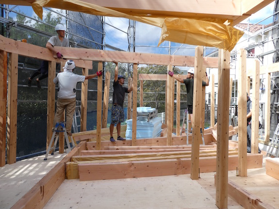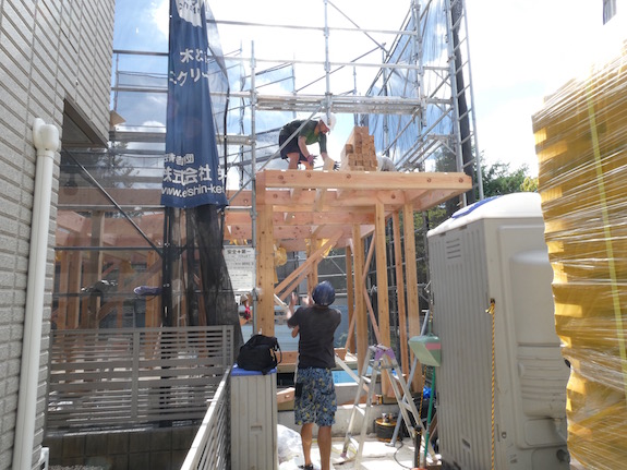 この住宅の敷地は旗竿敷地のため、クレーンを使わない手運び・人力での建て方です。