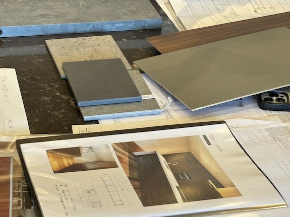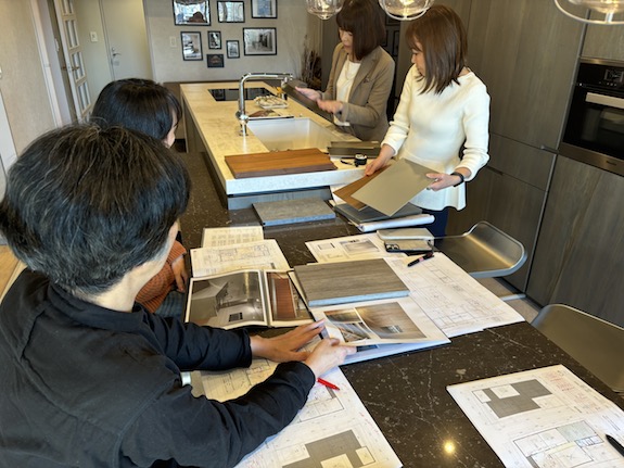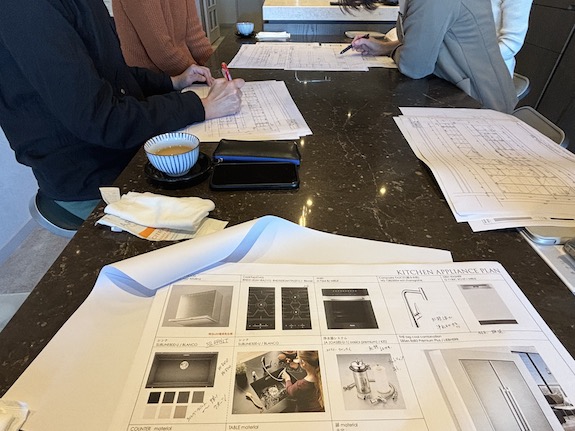 建て主の方から前もって頂いたイメージ写真をもとに仕上げのサンプルも提案があり、仕上げの方向性やデザインに関わる取っ手の有無、トールユニットの高さと間接照明の関係等インテリア全体の打合せも行いました。