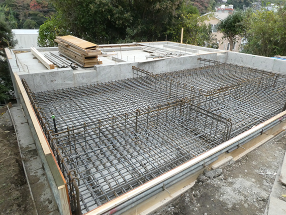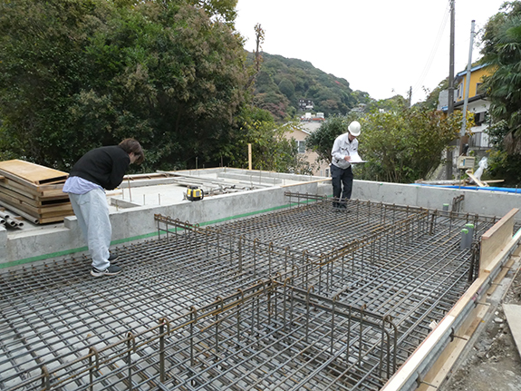 傾斜地に建つ住宅、『遠くの海を望む家』(地下RC1階+地上木造2階建)の1階基礎の配筋検査に、構造設計の中村さん(中村哲建築設計事務所)と行き、建築確認検査機関の中間検査(2回目)も受検しました。(11/14)