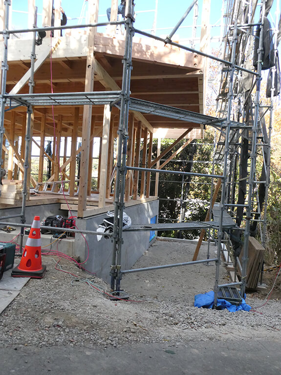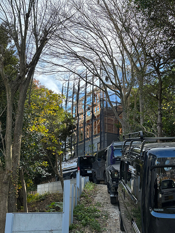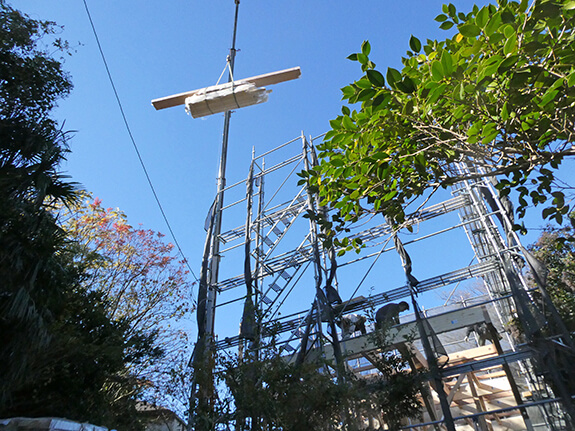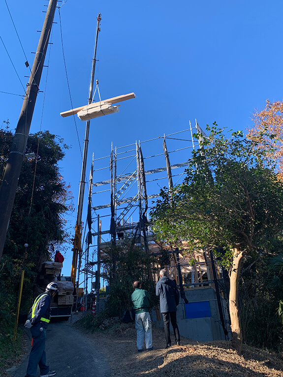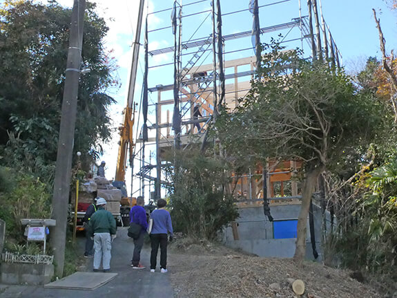 葉山の傾斜地に建つ住宅『遠くの海を望む家』(地下RC1階+地上木造2階建)は、冬の青空の下、建て方を行い上棟しました。