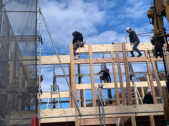 お昼前には建て主の方お見えになり、「地下工事の時は小さく見えたけど、地上の木造部分が実際に立ち上がると大きく見える」との感想を持たれたようです。