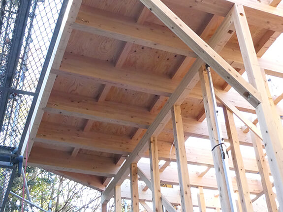 2階は1階よりも1.8m跳ね出した、片持ち構造(キャンチレバー、オーバーハング)とした部分も無事組み上がりました。片持ち構造の下は、駐車スペースになります。