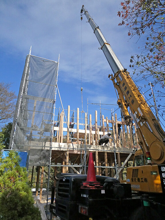 お隣の敷地も借りて、地面が平らなところに大型クレーンを設置しています。