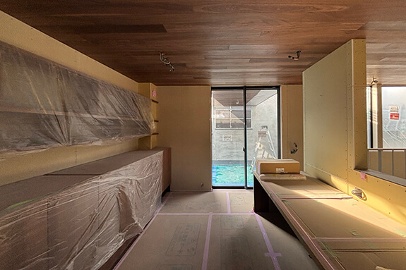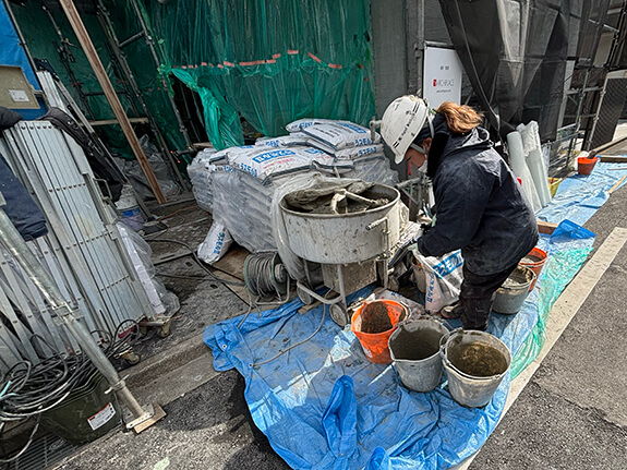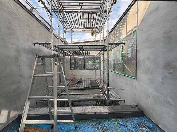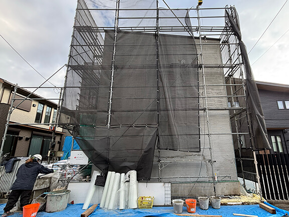 外部では、左官仕上げ(アイカジョリパット:モアプレーン)の下地となるモルタルを職人さんが施工中です。
