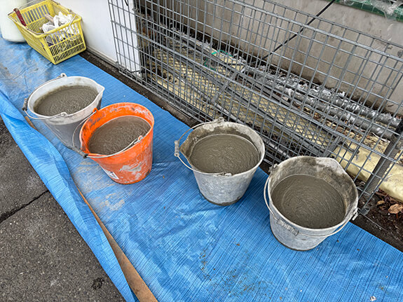 現場で練ったモルタルはバケツに入れて、道路側に設置した電動の滑車で吊り上げます。