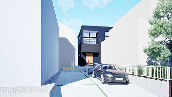 旗竿敷地のため、道路から見た外観です。アプローチ部分に2台分の駐車スペースを縦列で確保し、その奥に建物を配置しています。